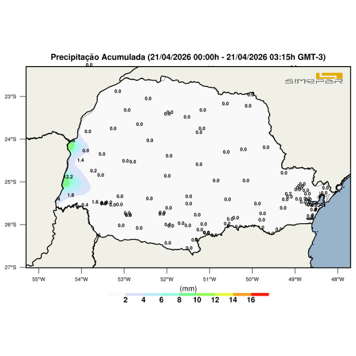 As áreas de instabilidade avançaram sobre o setor oeste do Paraná e persistiram ao longo da madrugada de hoje. O maior acumulado foi registrado na região de Santa Helena, com 12,2 mm. No entanto, observa-se um enfraquecimento gradual das ocorrências ao longo das últimas horas, com redução na intensidade e na abrangência dos eventos.