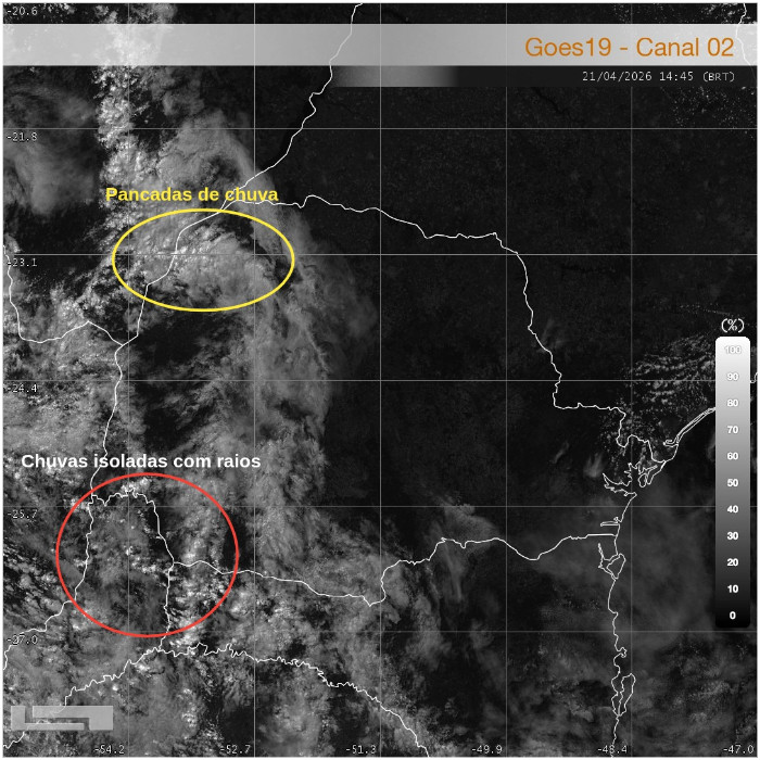 O feriado de Tiradentes é marcado pela presença de nuvens nas diversas regiões paranaenses, com destaque nesta tarde para toda metade Oeste. Nas regiões de fronteira com os países vizinhos e divisa com Santa Catarina, a elevada umidade relativa do ar, com valores mínimos ao redor dos 70%, somado ao aquecimento, são combustível para formação de áreas de instabilidade. É o que vem sendo registrado na região, com pancadas de chuva distribuídas irregularmente com alguns raios. No Noroeste, há formação de chuvas isoladas, entre Querência do Norte, Loanda e Cidade Gaúcha, mas sem descargas atmosféricas. Na região de Mandaguaçu, Engenheiro Beltrão e Barbosa Ferraz, chuvas isoladas com fraca intensidade também são registradas.