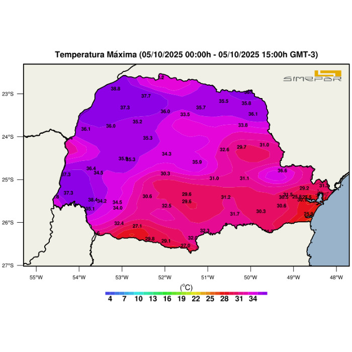 O transporte de calor mediante escoamento dos ventos nos baixos níveis da troposfera (~1500 metros) favorece expressiva elevação das temperaturas no interior paranaense. Os destaques desta tarde, até o momento, são: Loanda (38,8 °C), Capanema (38,4 °C), Paranavaí (37,7 °C), Cidade Gaúcha (37,3 °C), São Miguel do Iguaçu (37,3 °C) e Santa Helena (37,3 °C). Curitiba ultrapassou a marca dos 30 °C nesta tarde também, anotando até agora 30,5 °C nos termômetros. E as temperaturas seguem subindo nas próximas horas.