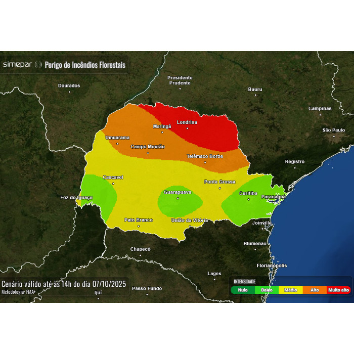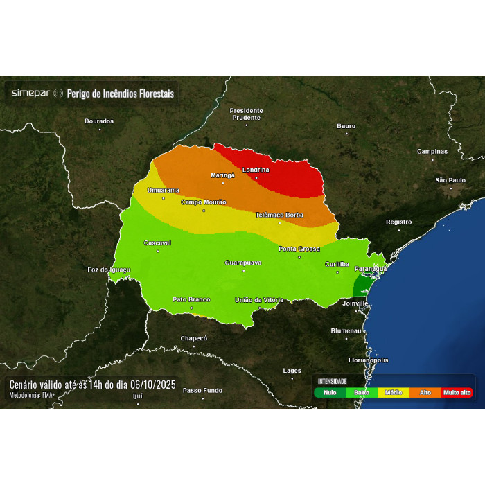 Com calor intenso, se eleva o risco para incêndios florestais, com destaque para o Norte Pioneiro. No mapa abaixo são apresentadas as áreas com risco potencial para ocorrência nas próximas 24h.