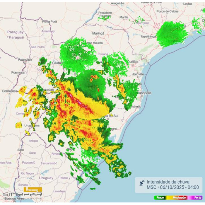 O tempo apresenta maior instabilidade sobre o Rio Grande do Sul, onde ocorre, agora, o deslocamento de uma frente fria. Na imagem de satélite, observa-se extensa área de nebulosidade sobre a região, associada a chuvas com trovoadas e ventos de intensidade moderada a forte. No Paraná, o tempo permanece abafado, com possibilidade de chuvas isoladas e pontuais, principalmente a partir do setor oeste.