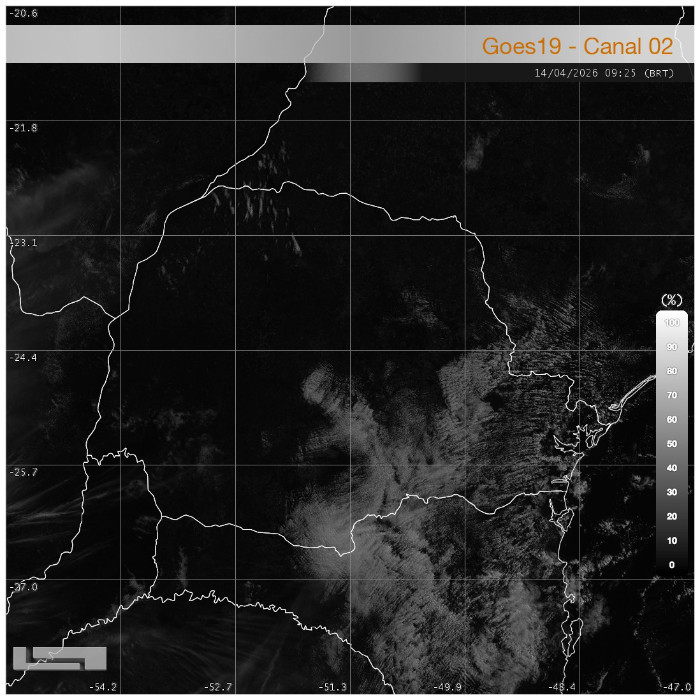 Nesta madrugada, as condições atmosféricas no Paraná permanecem predominantemente estáveis, com maior variação de nuvens e possibilidade de garoa ou chuva fraca entre a Serra do Mar e o Litoral. Na região Centro-Sul, entre os municípios de Bituruna, Palmas e General Carneiro, há maior concentração de nebulosidade baixa.