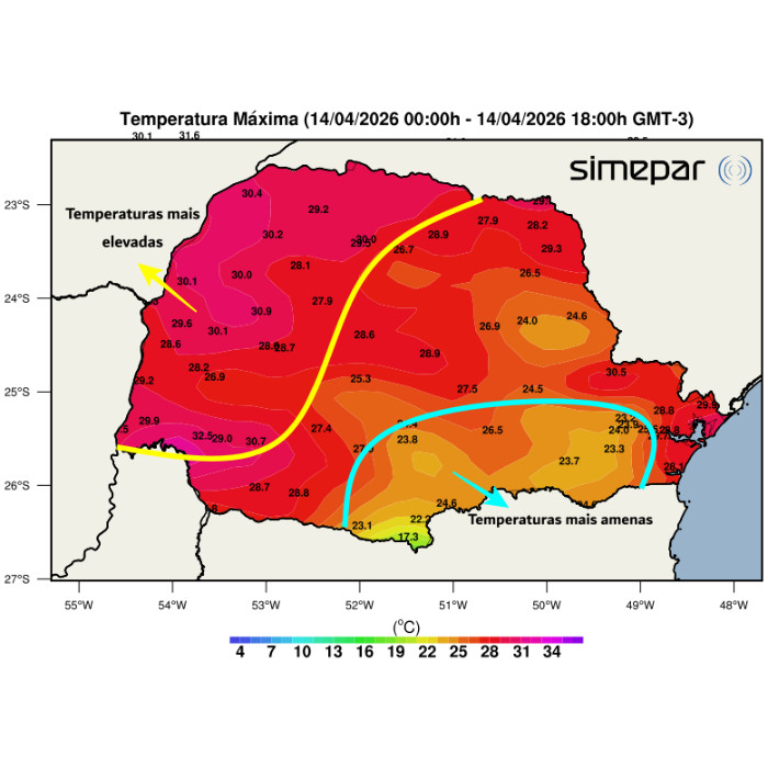 A metade oeste do Paraná teve mais uma tarde com temperaturas elevadas, com valores ao redor dos 30 °C nos termômetros. Destaque para Capanema, no Sudoeste, que registrou máxima de 32,5 °C, seguida de Goioerê (INMET), no Oeste, com 30,9 °C. Em um cenário diferente, devido à circulação marítima, o Centro-Sul, Sudeste, RMC e Campos Gerais tiveram temperaturas mais amenas com muitas nuvens ao longo do dia. O Sol apareceu, favorecendo elevação das temperaturas, com máximas variando entre 22 e 24 °C no geral. Apenas no extremo sul, em General Carneiro a máxima registrada não ultrapassou os 20 °C, com 17,3 °C nos termômetros durante a tarde. Nas próximas horas, a nebulosidade aumenta no Centro-Leste, com potencial para chuviscos no Leste.