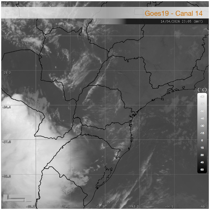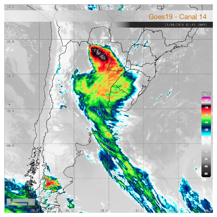 O principal destaque desta madrugada está fora do estado: a atuação de um Sistema Convectivo de Mesoescala entre o Paraguai e o norte da Argentina, associado à presença de uma área de baixa pressão em superfície nessa região. Na imagem a seguir, obtida pelo satélite GOES-19, observa-se a temperatura do topo das nuvens. Os tons mais escuros, próximos ao preto, e os núcleos em tons mais claros em seu interior — sobre o Paraguai e a Argentina — indicam nebulosidade com grande desenvolvimento vertical, ou seja, com topos muito frios.