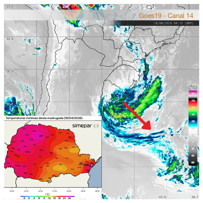 Durante a madrugada, sob influência do afastamento do ciclone em direção ao Atlântico — cuja tendência de deslocamento está indicada na imagem de satélite a seguir, pela seta vermelha —, há variação de nuvens em todo o Paraná, inclusive com ocorrência de garoa/chuva fraca e esparsa entre as regiões Oeste, Sudoeste e Centro-Sul.