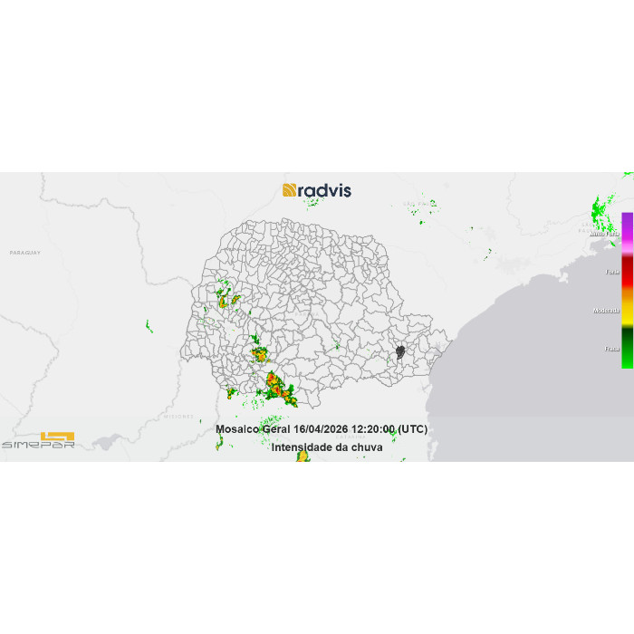 Neste momento, as imagens de radar indicam a presença de áreas de instabilidade atuando de forma bastante irregular sobre o Paraná. Os núcleos mais organizados concentram-se principalmente entre as regiões de Clevelândia, Honório Serpa e arredores, onde há registro de chuva com intensidade moderada, podendo vir, ao longo das proximas horas, acompanhada de trovoadas. Pancadas de chuva também são registradas nas regiões de Rio Bonito do Iguaçu e Assis Chateaubriand. Nas demais regiões, não há registro de chuva neste momento, com predomínio de tempo mais estável. Ao longo das próximas horas, essas instabilidades tendem a se manter irregulares, com deslocamentos pontuais e possibilidade de novas pancadas de chuva localizadas.