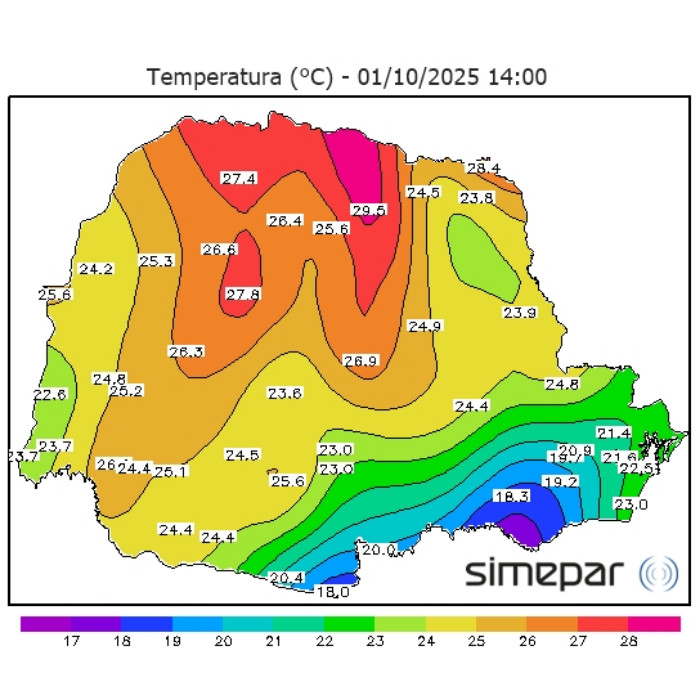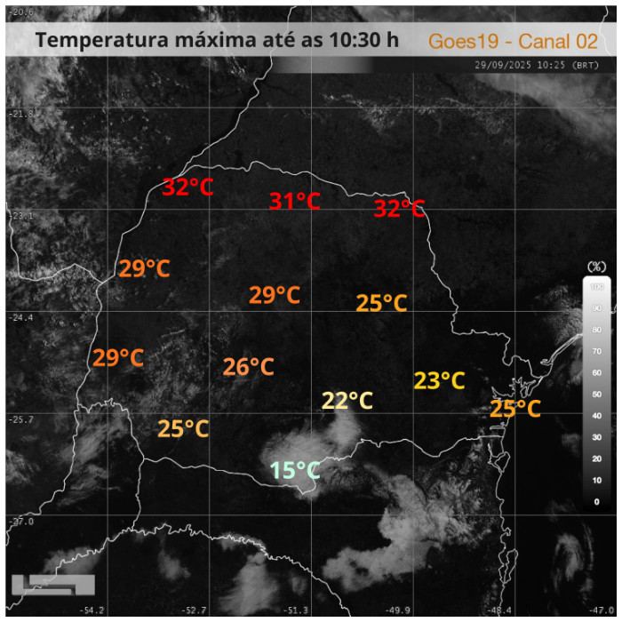 A manhã desta segunda-feira é marcada por temperaturas elevadas em boa parte do Paraná, já ultrapassando os 30 °C com facilidade em áreas de divisa com SP e MS. Destaque para 32,3 °C em Cambará, no Norte Pioneiro e Loanda, no Noroeste. Na capital os termômetros já marcam 23 °C e o tempo predomina ensolarado. Já no Sul, ainda faz frio de 15 °C em Palmas, onde ocorreu formação de nevoeiro.
