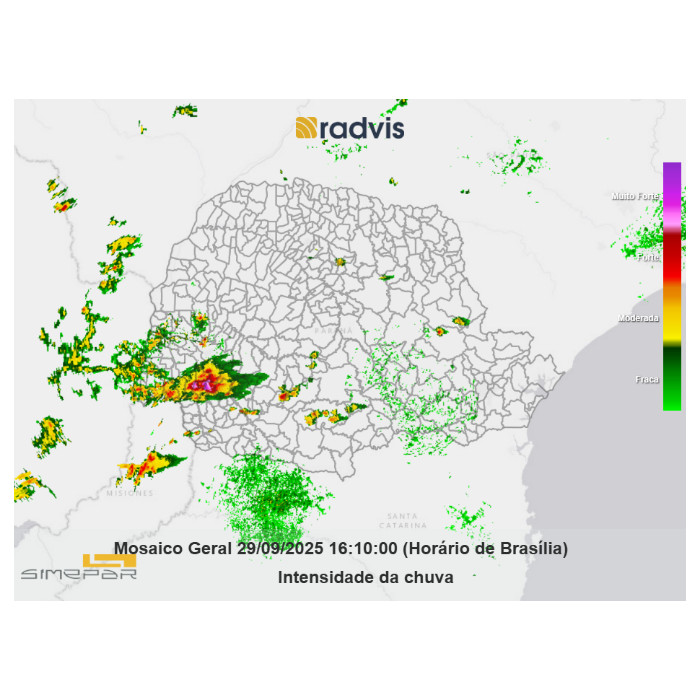 A expectativa é que o calor intenso e a disponibilidade de umidade favoreça a formação de chuva com trovoadas e tempestades localizadas nas próximas horas, principalmente no Oeste, áreas do Noroeste, Sudoeste e Centro-sul, onde inclusive não se descarta a ocorrência de granizo localizado ao longo da tarde e início da noite.