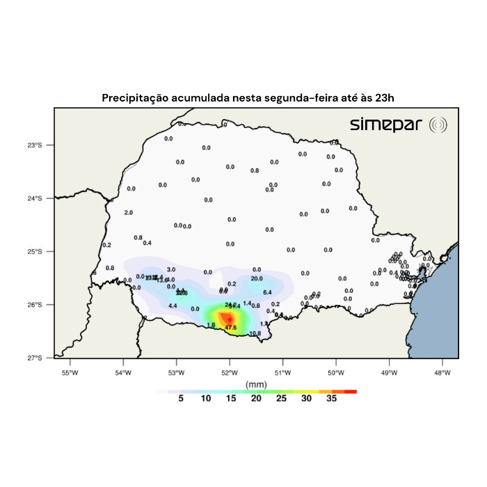 Os acumulados de chuva registrados pelos pluviômetros do INMET e do Simepar, mostrados na imagem a seguir, refletem esse padrão, com volumes registrados entre as regiões Sudoeste e Centro-Sul. O maior acumulado até às 23h foi computado pela estação meteorológica do município de Palmas, com 47,6 mm.