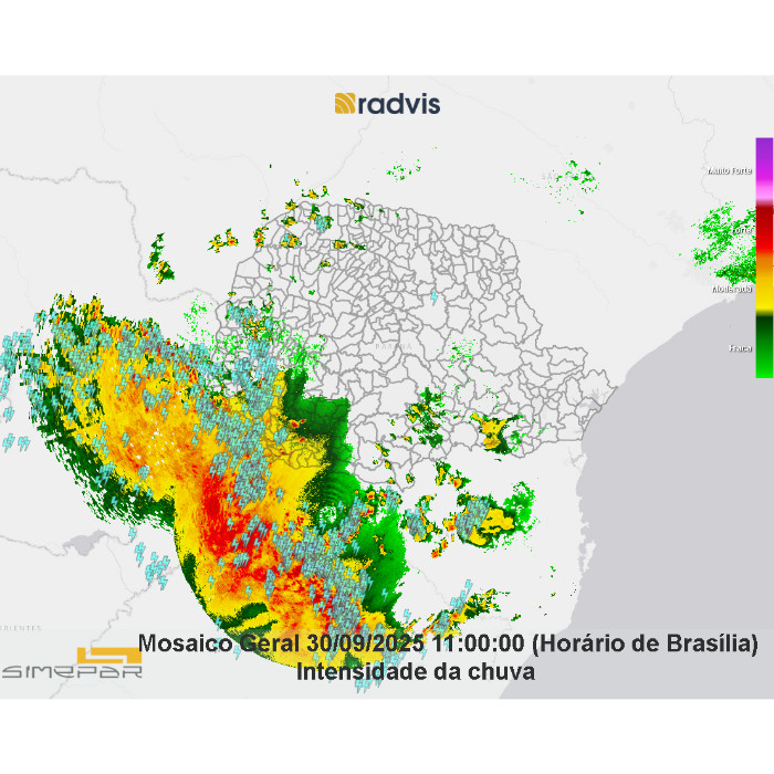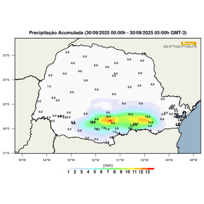 Durante a madrugada, foram registradas chuvas intensas acompanhadas de elevada incidência de descargas elétricas, com maior concentração nas regiões dos Campos Gerais, Centro-Sul e, no momento, na região Leste do estado. Na porção oeste, a instabilidade perdeu força, mas a elevada temperatura e disponibilidade de umidade resultou em pancadas de chuva isoladas e de menor intensidade. O sistema segue seu deslocamento em direção ao litoral paranaense. Os maiores acumulados de precipitação até o momento foram observados na região Centro-Sul, com 18,6 mm registrados.