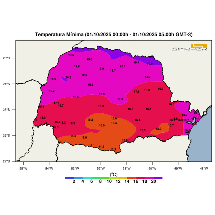 As instabilidades atmosféricas observadas nos últimos dias no estado do Paraná não estão associadas à atuação ou à passagem de uma frente fria. Dessa forma, nnão há substituição de massas de ar que favoreça o avanço de ar frio, o que mantém as temperaturas mínimas elevadas. Como pode ser observado na imagem de análise, todas as regiões do estado registram temperaturas mínimas superiores a 13 °C. Destacam-se, em especial, o norte do Paraná e a região litorânea, onde os valores mínimos se aproximam dos 20 °C. Esse padrão térmico é consistente com a presença de uma massa de ar mais quente e úmida, que favorece a manutenção do tempo instável e inibe quedas acentuadas de temperatura.
