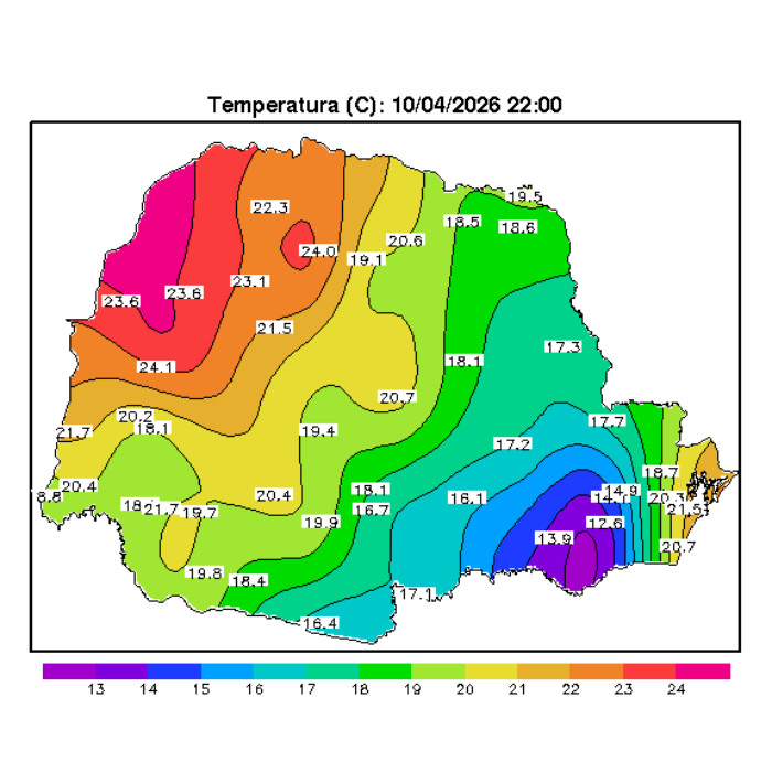 Ao longo da quinta-feira, o Paraná apresentou tempo estável, com predomínio de sol nas regiões do Oeste, enquanto no Leste houve presença de nebulosidade variável ao longo do dia. Na imagem, são observadas as temperaturas registradas nesta. No Oeste e Noroeste, os valores variam entre 23 °C e 24 °C. No Norte, ficam entre 18 °C e 21 °C. No Sudoeste, os termômetros marcam entre 17 °C e 20 °C. No Centro-Sul e nos Campos Gerais, as temperaturas variam entre 16 °C e 19 °C. Na Região Metropolitana de Curitiba, os valores são mais baixos, entre 13 °C e 16 °C, enquanto no Litoral os registros ficam entre 20 °C e 22 °C.