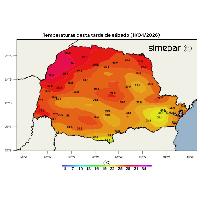 Já no Centro-Oeste do Paraná, as temperaturas máximas ultrapassaram os 25 °C, com valores próximos de 30 °C na faixa oeste do estado.