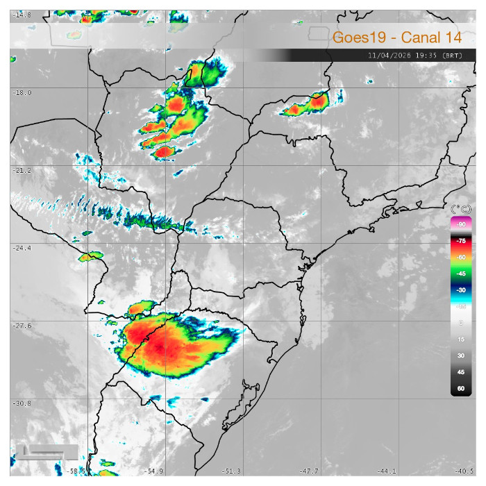 Neste momento, a imagem de satélite do canal infravermelho indica predomínio de tempo estável sobre o Paraná, com pouca nebulosidade atuando no estado e ausência de áreas de instabilidade organizadas. Os núcleos convectivos mais intensos concentram-se sobre o centro-norte do país e também no oceano, afastados da região. Assim, o tempo segue firme em todo o estado, sem condição para chuva neste momento