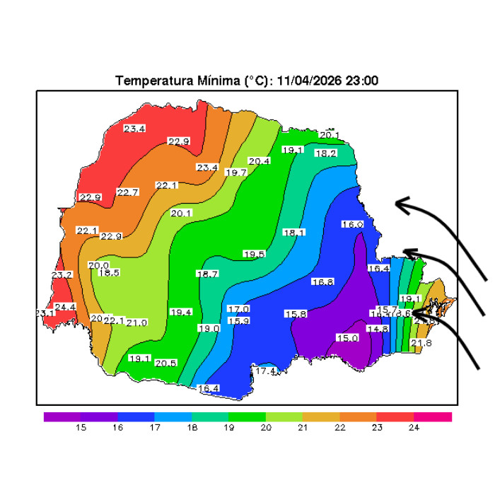 A circulação dos ventos que sopram do oceano para o continente aceleram durante o período da noite, reforçando o padrão observado durante o dia nos Campos Gerais, Sudeste, RMC e litoral: muitas nuvens, ventos e sensação de frio. Em alguns momentos do dia houve registro de chuviscos entre a RMC e as praias, principalmente na faixa litorânea e a Serra do Mar. No momento o cenário se repete, com pancadas de chuva aumentando no litoral, em direção à RMC. Com os ventos e a queda de temperatura, a sensação é de frio na RMC, Campos Gerais e Centro-Sul. As setas no mapa em anexo mostram a direção predominante dos ventos. No Oeste e Noroeste do Paraná o tempo segue abafado, com mínimas acima dos 20 °C.