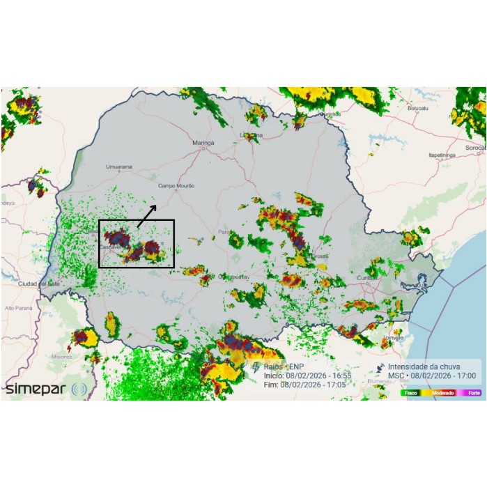 Na imagem, o retângulo preto destaca as tempestades mais intensas até às 17h05, atuando nas proximidades de Cascavel, Guaraniaçu, Corbélia e Cafelândia. Estas fortes instabilidades estão seguindo em direção ao Noroeste (indicada pela seta preta), região em que, até o momento, apresenta menor ocorrência de instabilidade, embora haja tendência de aumento ao longo do período.