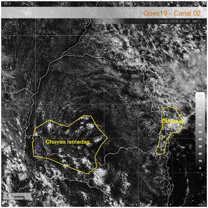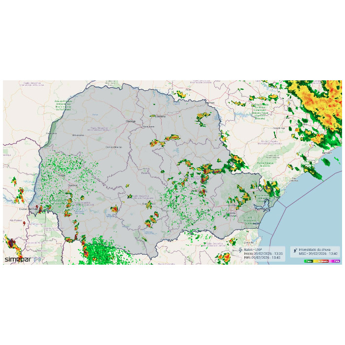 Durante a noite deste domingo, as instabilidades que atuaram ao longo da tarde e início da noite sobre o Paraná perderam força gradualmente. No momento, observa-se uma redução significativa das áreas de chuva, com predomínio de nebulosidade menos profunda e tempo mais estável na maior parte do estado. A imagem de satélite mostra que os núcleos mais intensos se afastaram ou enfraqueceram, restando principalmente áreas de nebulosidade associadas a nuvens médias e altas. Ainda assim, no Oeste do Paraná, há registro de áreas com chuva fraca a moderada, acompanhadas de raios. Dessa forma, o risco para temporais diminui consideravelmente neste horário, favorecendo um período de tempo mais calmo ao longo da madrugada. Devido à atmosfera quente e úmida, não se descarta a ocorrência pontual de chuva fraca e isolada, mas sem indicativo de fenômenos severos.