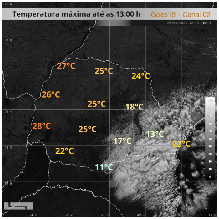 O Leste paranaense continua com predomínio de tempo encoberto ao longo desta sexta-feira, favorecendo com que as temperaturas se mantenham baixas para o horário. Mesmo já no início da tarde, faz apenas 11 °C nos termômetros em Palmas, na região Centro-Sul. Na Grande Curitiba a situação é bastante semelhante, com os termômetros marcando apenas 13 °C. Essa condição ocorre ainda, por conta do ingresso dos ventos úmidos do oceano para o continente. Apesar disso, no restante do Paraná o tempo predomina aberto com o sol variando entre pouquíssimas nuvens e temperaturas subindo, com destaque para a região Oeste, onde faz 28 °C na maioria dos municípios.