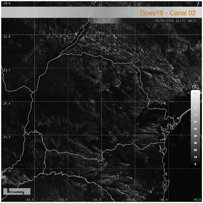 Final de manhã deste sábado e o tempo continua estável no Paraná, sem chuvas. A nebulosidade até está um pouco mais variável em alguns setores, mas até o momento não há registro de precipitação. Destaque para as temperaturas elevadas no Oeste e Noroeste do estado, com valores acima dos 30°C. Próximo a divisa com o Mato Grosso do Sul a umidade relativa está mais baixa: perto de 45%.