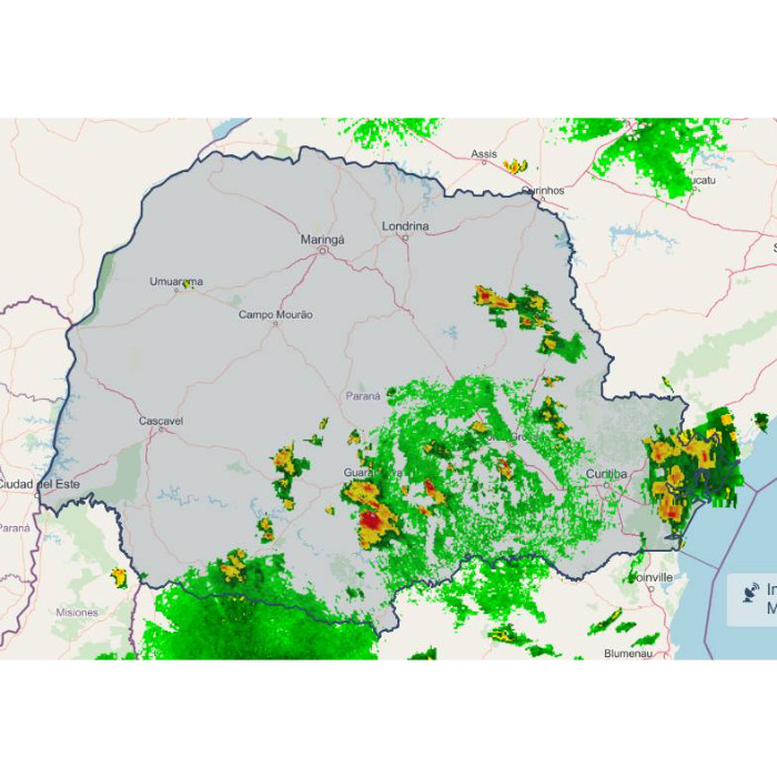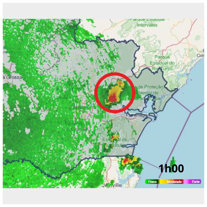 A imagem abaixo exibe a refletividade do radar meteorológico no Leste do Paraná. A circunferência em vermelho destaca a área de chuva forte em seu estágio maduro, aproximadamente à 1h. No momento, esta instabilidade já se encontra em dissipação.