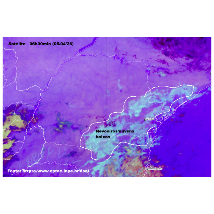 Amanheceu sem chuvas no Paraná neste domingo. Na maior parte do estado o céu está com pouca nebulosidade no momento. Já entre o Centro-Sul, Campos Gerais e a RMC há presença de nevoeiros/nuvens baixas. No aeroporto de São José dos Pinhais a visibilidade horizontal é de 400 metros (06h40min). O Simepar deseja a todos uma Feliz Páscoa!