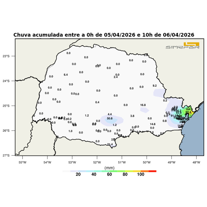 O domingo e a madrugada desta segunda-feira foram de muita chuva em parte da Região Metropolitana de Curitiba e princiaplmente sobre o Litoral norte. Os ventos úmidos que sopraram do oceano para o continente, associado ao efeito orográfico favorecem a formação de nuvens de chuva por vários momentos nessa região do estado, tanto que em menos de 24 horas choveu 164,2 mm, que equivale a média de abril, que é 160,5 mm. Em Morretes e Guaraqueçaba o volume de chuva também foi significativo atingindo 52,8 mm (INMET) e 164,2 mm, respectivamente. Na RMC, destaque para Campina Grande do Sul com 58,2 mm e no Centro do estado, para o distrito de Entre Rios (Guarapuava) com 50,8 mm.